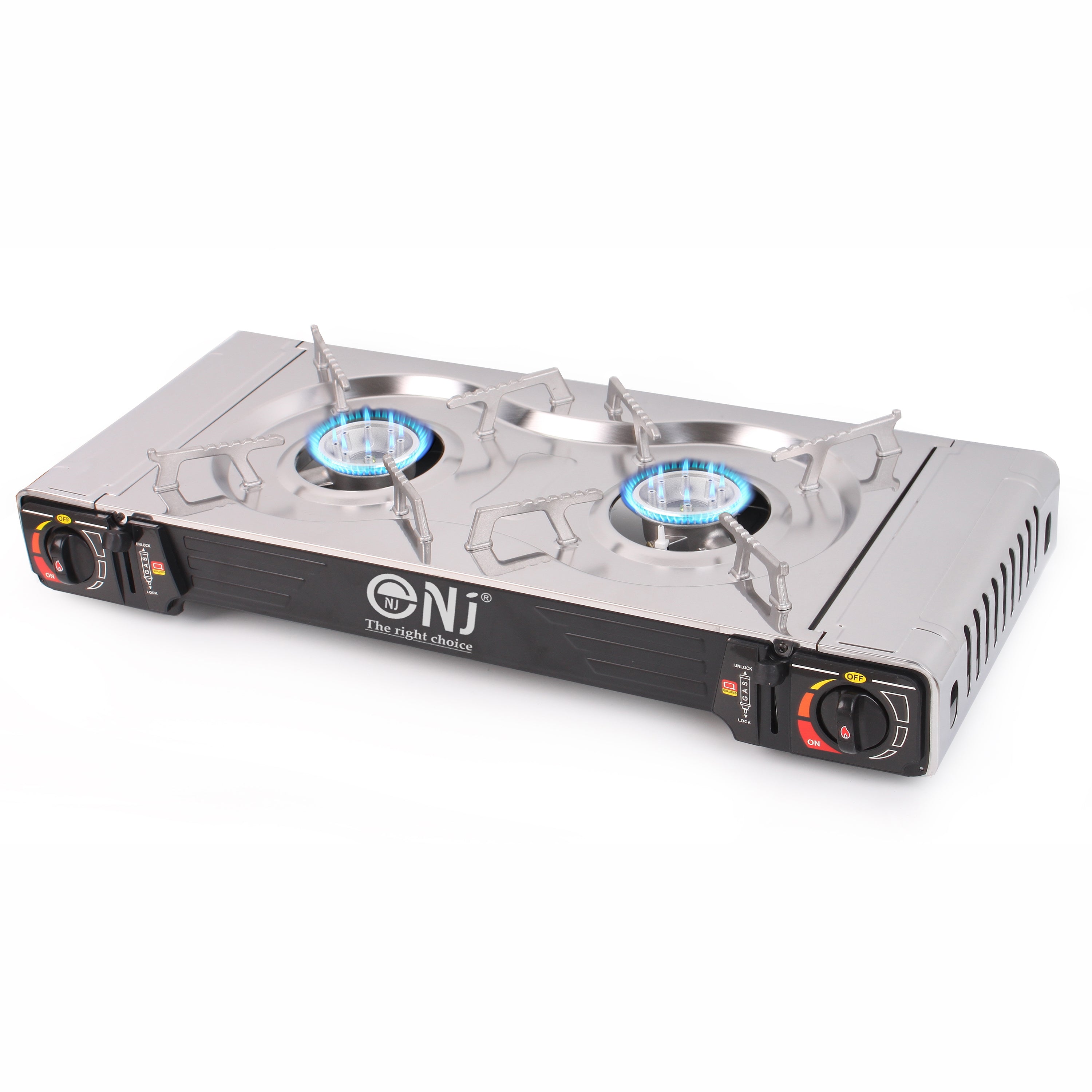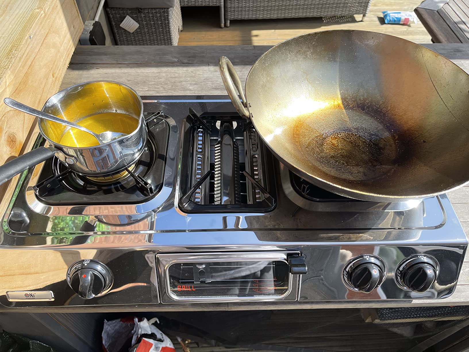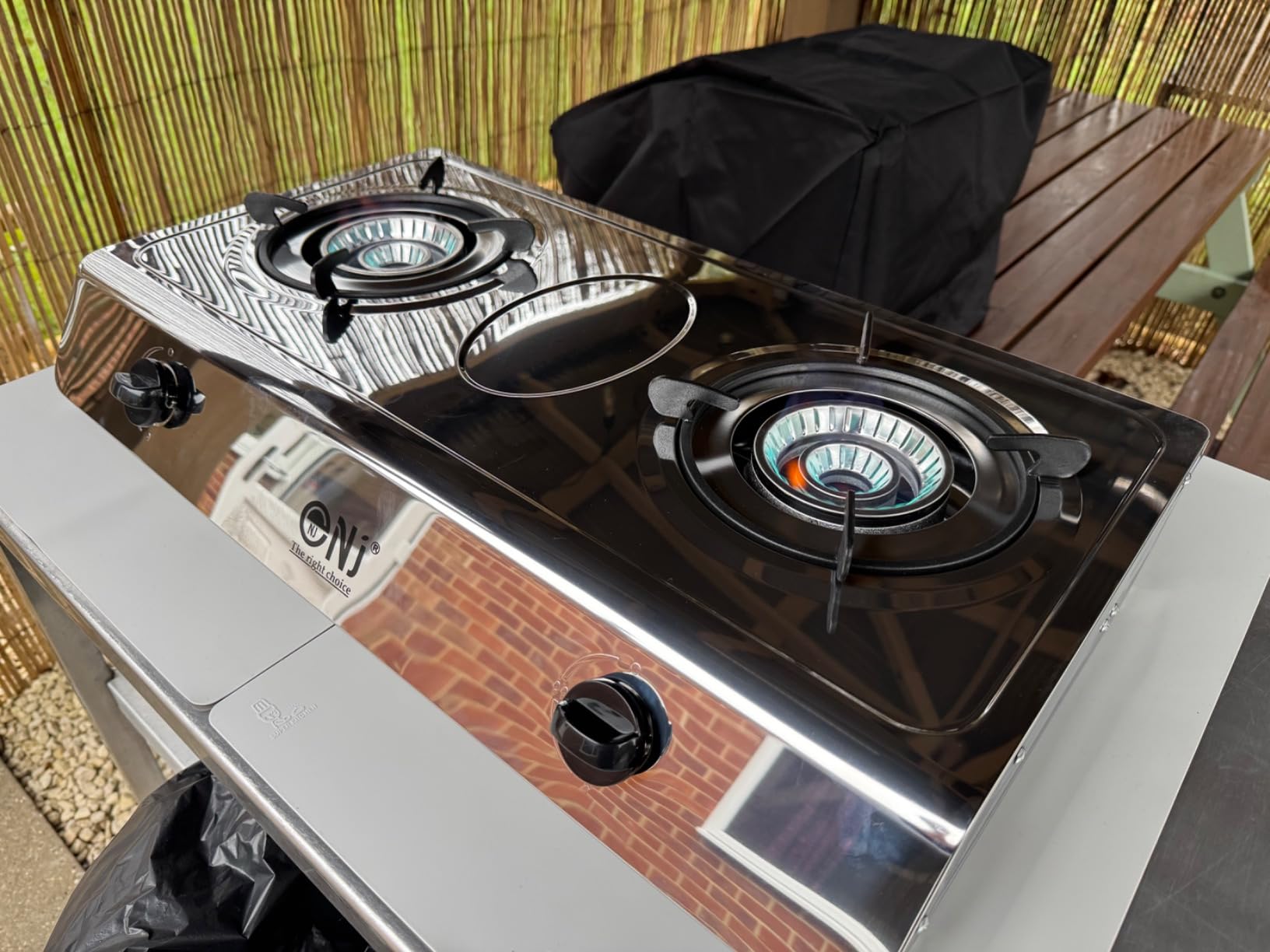 This is a great gas hob that I use with bottled propane for my garden ‘cook shack’. I have a thing for stainless steel as it’s durable and easy to clean, so that’s one tick in the box. Two 4kW double-ring burners, so it’s powerful, lots of control on each as well, that’s another tick. Pan supports are good, removable as well, for easy cleaning.