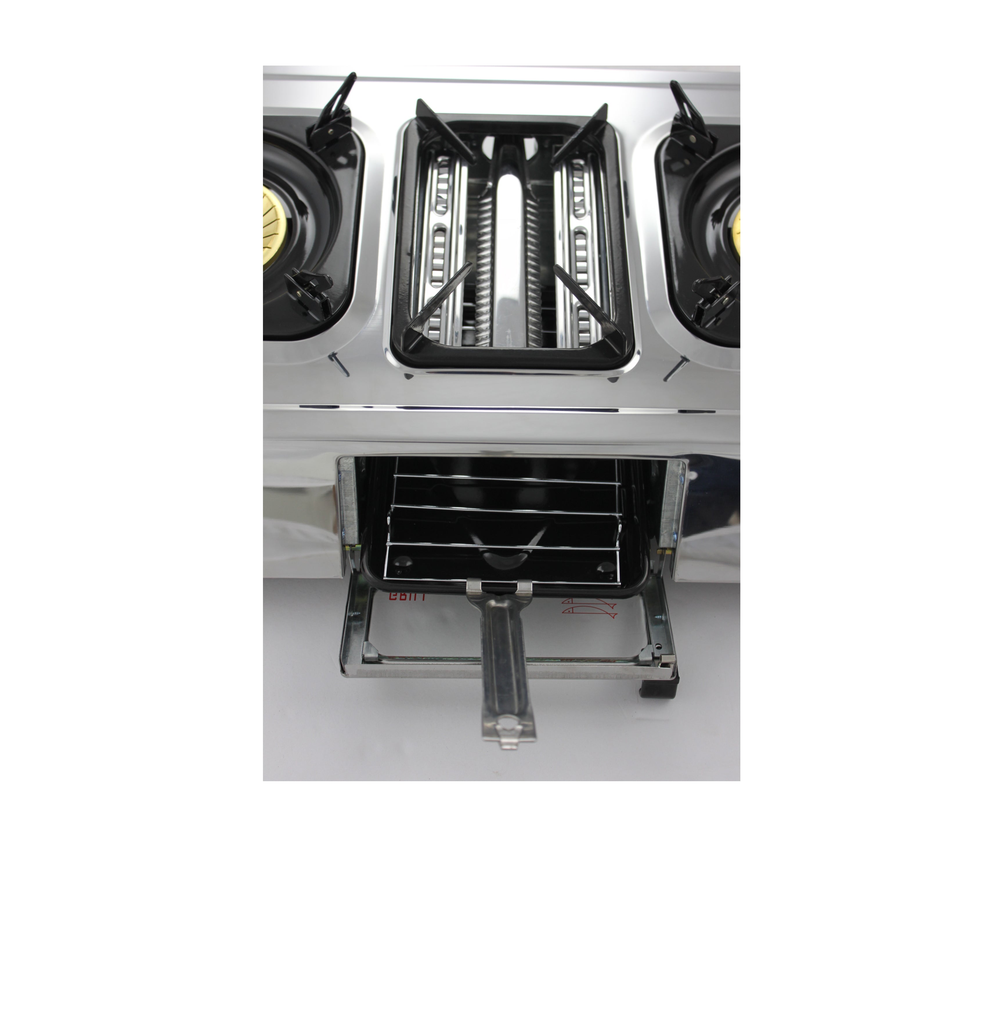 This portable camping outdoor gas cooker has two powerful and efficient burners plus an additional middle grill which works as a toaster when facing upward and as a mini oven when facing downward. The gas stove is also equipped with a lid to ensure its solidity and long lasting which will give you a trouble free and safe operation.