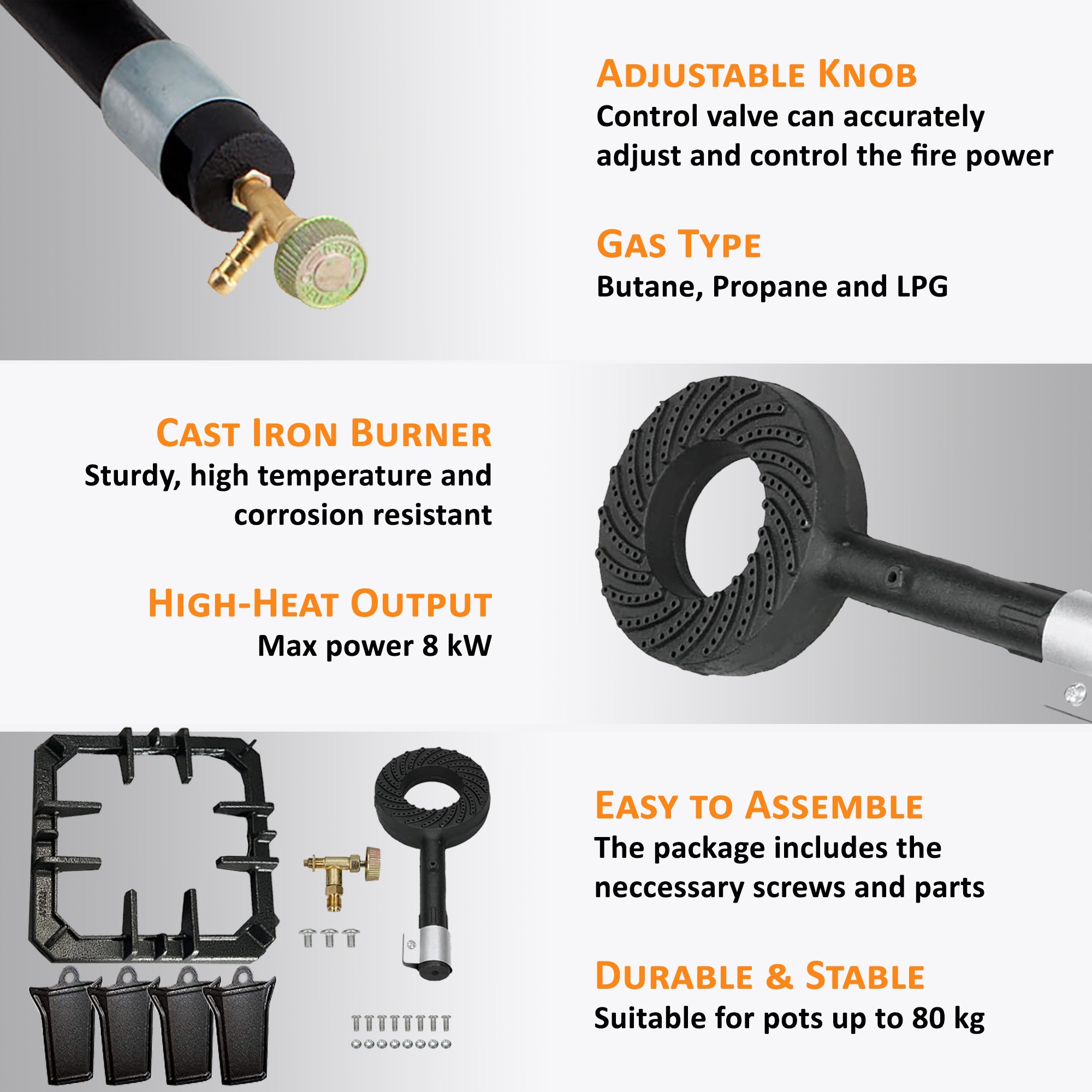 Features a boiling ring mounted in a frame. Very easy to assemble – all you need is just a screwdriver. It works from extremely high to low temperatures thanks to the variable flame control with a maximum Heat input - 8.0 kW. It operates with Butane, Propane or LPG Gas Cylinders and connects to your chosen gas supply with a rubber hose and a low-pressure gas regulator.