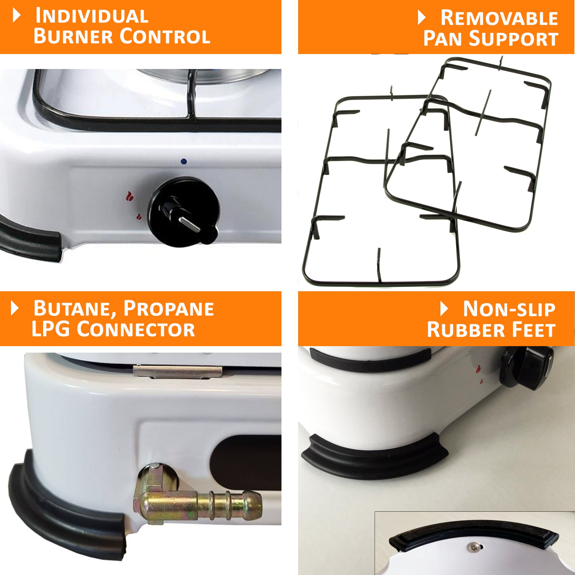 Works with LPG, butane, and propane gas cylinder. Connects with rubber hose and low-pressure gas regulator.