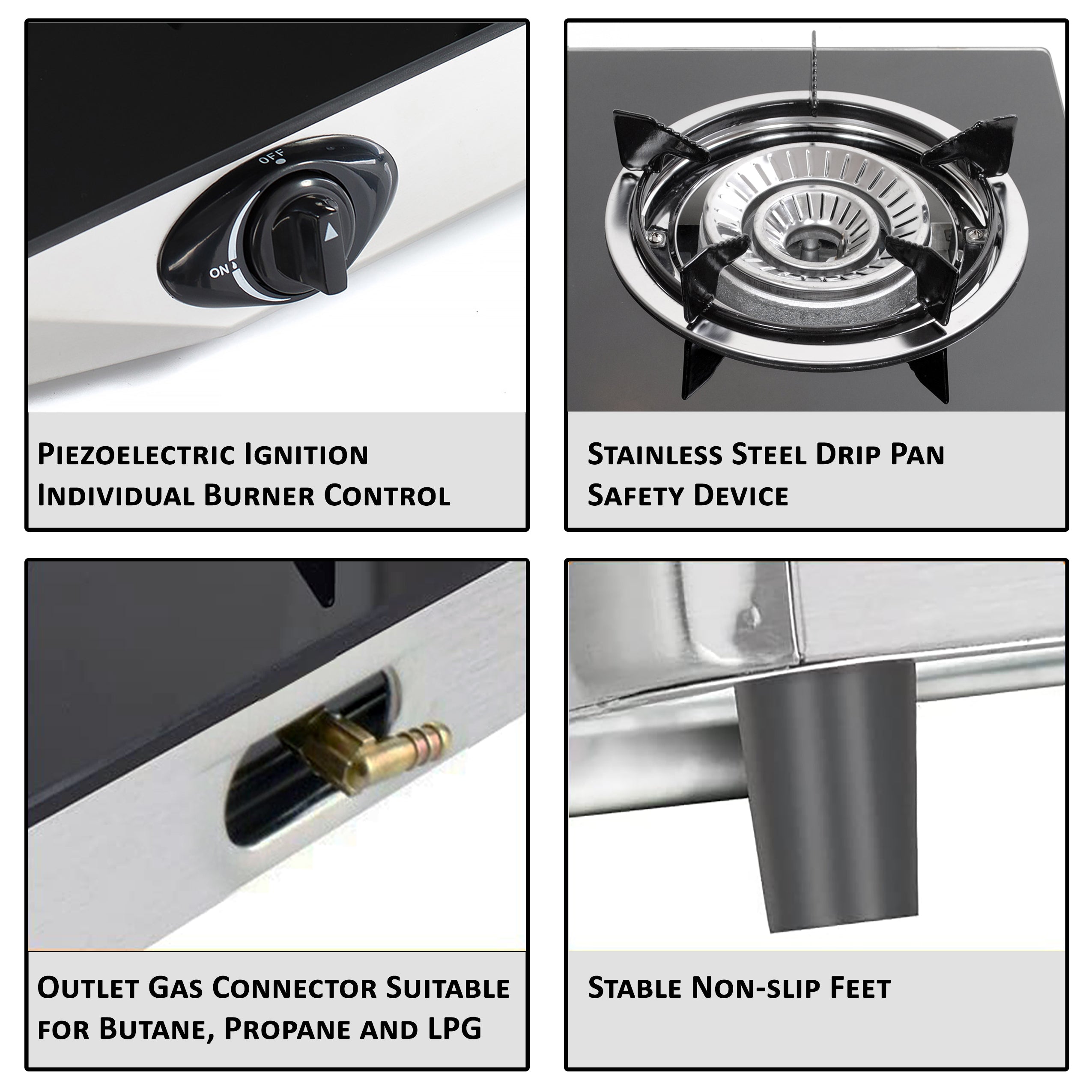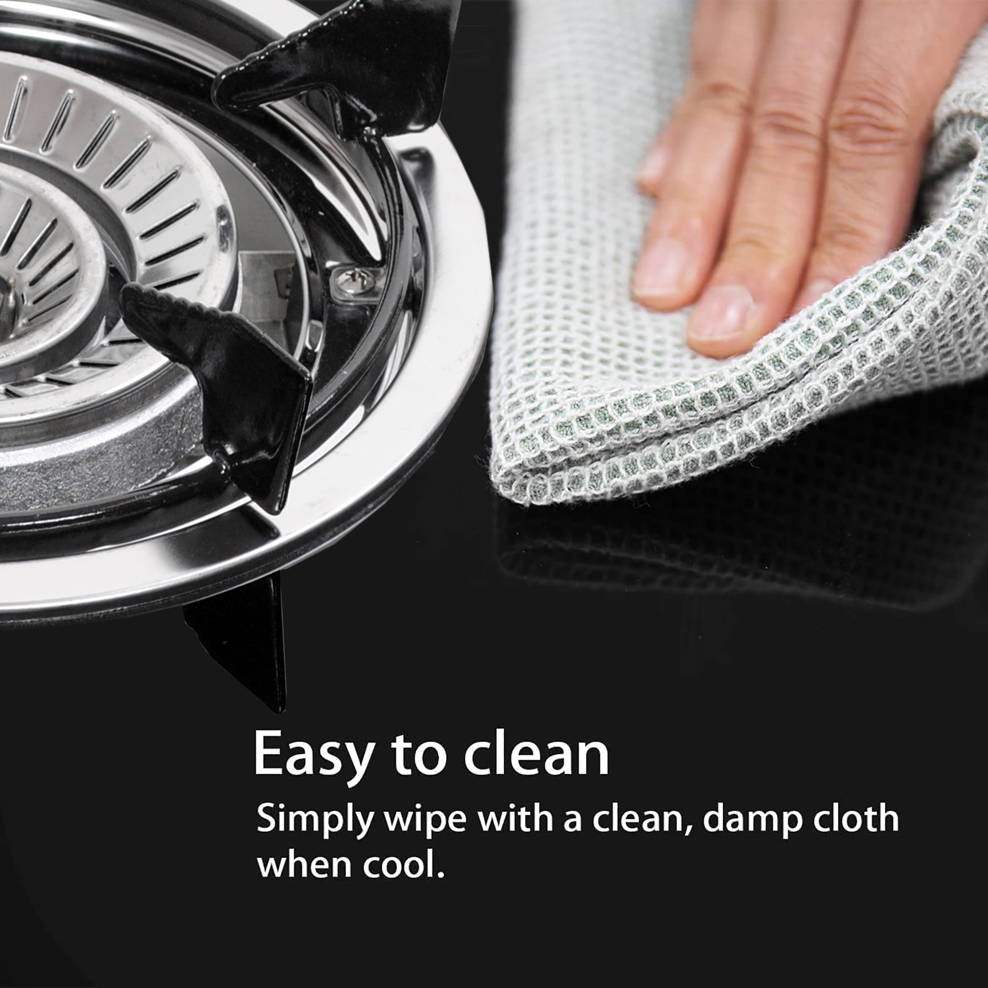 The flame is easily adjustable thanks to the heat resistant knob; the cooker comes with a convenient automatic piezo ignition with which you get heat instantly. The design of this cook-top combined with its black glass surface allows you to simply remove the trivets and wipe down the stove.