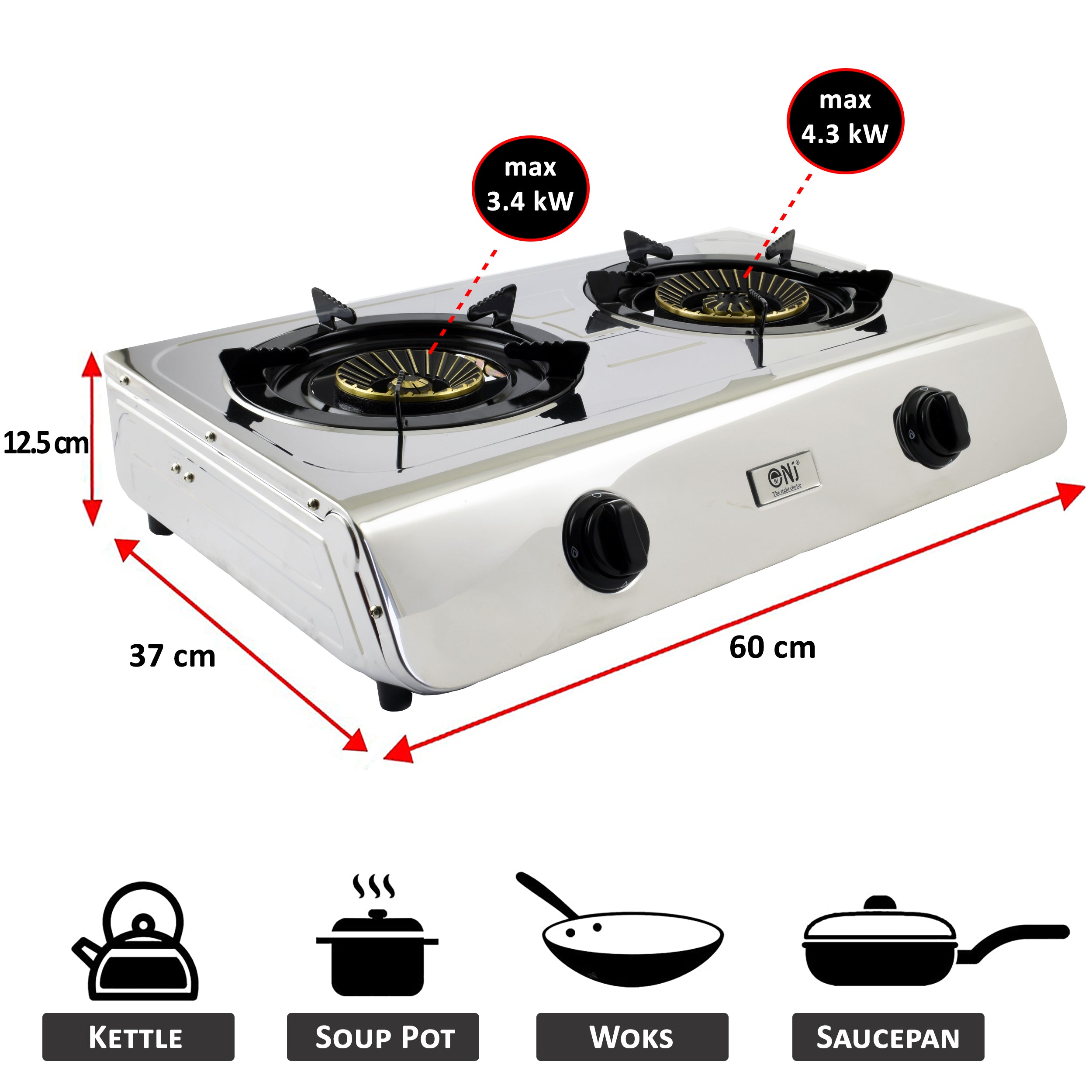 - 2 Burners Heat Input - max 7.7 kW, Low Gas consumption - max. 1 x 339 + 1 x 268 gr/h