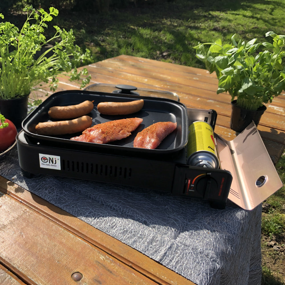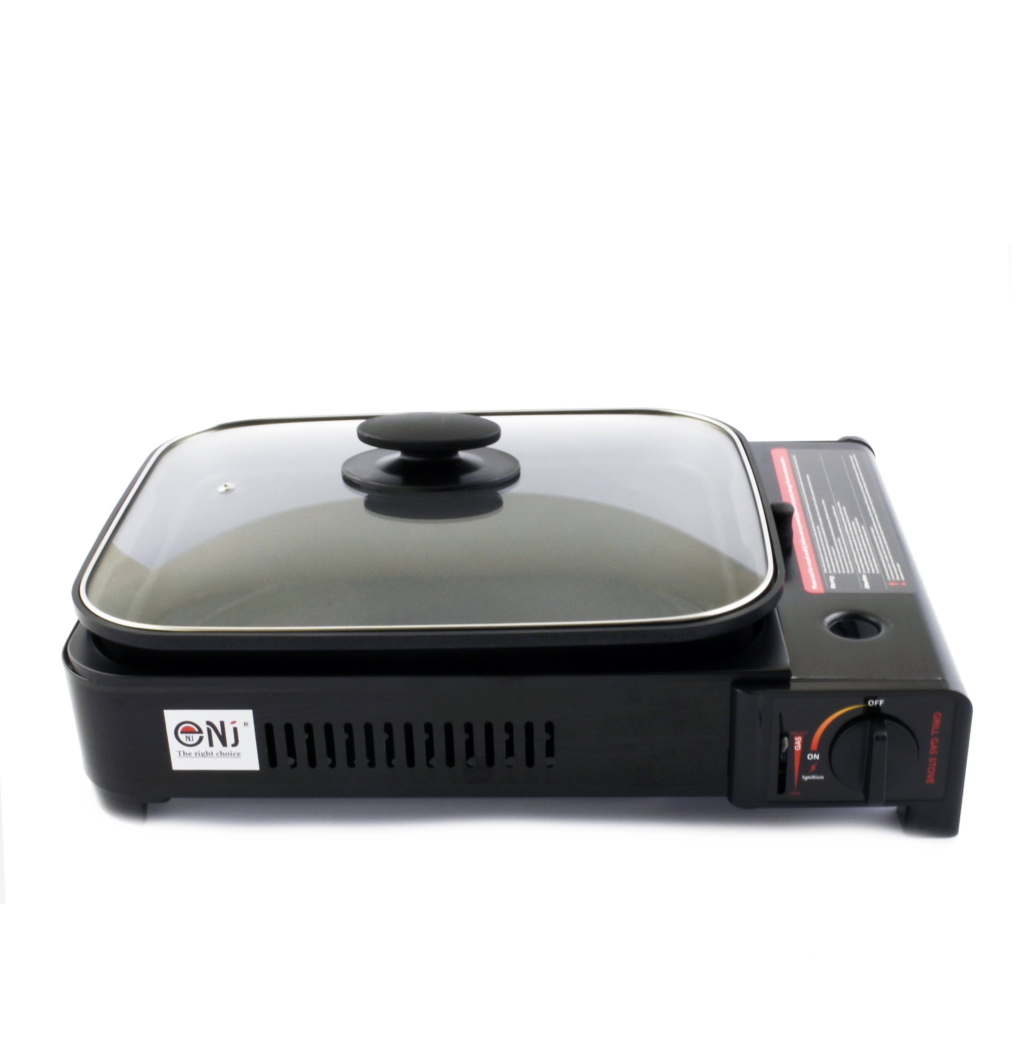 Lightweight and easy to carry BBQ Grill is a portable gas stove that comes complete with a grill pan and a lid. You can control the flame with the dial to adjust its strength according to your needs. The automatic piezo ignition works reliably on this stove.